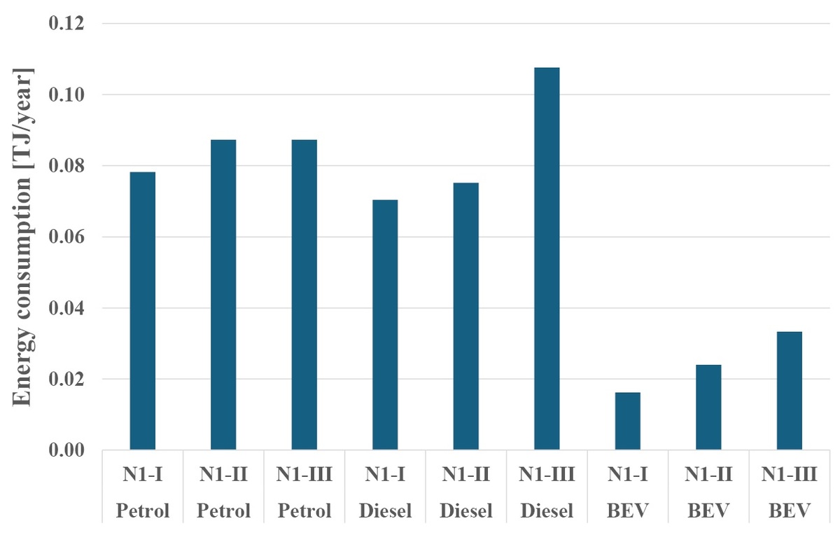 This paper compares CO₂ emissions, energy use, operating costs, and external climate costs of light commercial vehicles (N1-I–N1-III) with spark-ignition, compression-ignition, and battery-electric propulsion, operating under the Polish electricity mix. Fuel and electricity consumption, as well as CO₂ emissions, for ICE vehicles were obtained from the COPERT 5 model, while BEV emissions were calculated using national KOBiZE emission factors. Annual mileage was set at 30,000 km. The results show that BEVs reduce CO₂ emissions by approximately 25–50% and energy costs by 35–55% compared with combustion vehicles, with the most significant benefits in the heaviest N1-III class. External costs of CO₂ are also substantially lower for BEVs. However, the high carbon intensity of the Polish power sector limits achievable reductions, underscoring that fleet electrification must be accompanied by power system decarbonization to fully exploit its climate benefits.