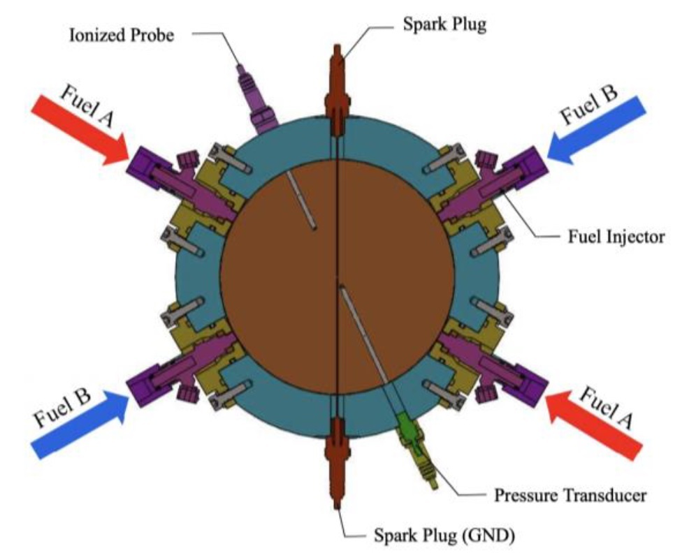 Compared to single-spray and conventional axis-opposed injection systems, the proposed multi-injection strategy promotes droplet atomization and improves fuel-air mixture homogeneity through optimized injector layout and injection timing. Additionally, combustion tests using low-reactivity fuel were conducted to assess the feasibility of this injection strategy under challenging ignition conditions. In-cylinder pressure measurements were analyzed to evaluate the effects of fuel injection conditions and the influence of fuel collision behavior on combustion performance. The results demonstrate that the proposed multi-injection approach is a promising strategy for enhancing combustion efficiency and improving combustion control in advanced engine systems.